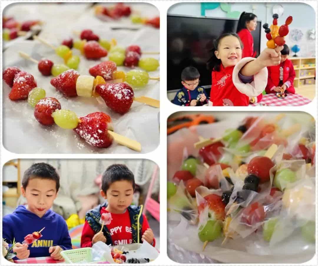 山楂、草莓、橘子……各种果肉串起来,裹上糖浆,晾凉,不一会儿,冰糖葫芦就做好了。有酸酸甜甜的美味, 蕴含着劳动的幸福,希望每一个宝贝都能像冰糖葫芦一样甜甜美美,幸福圆满。