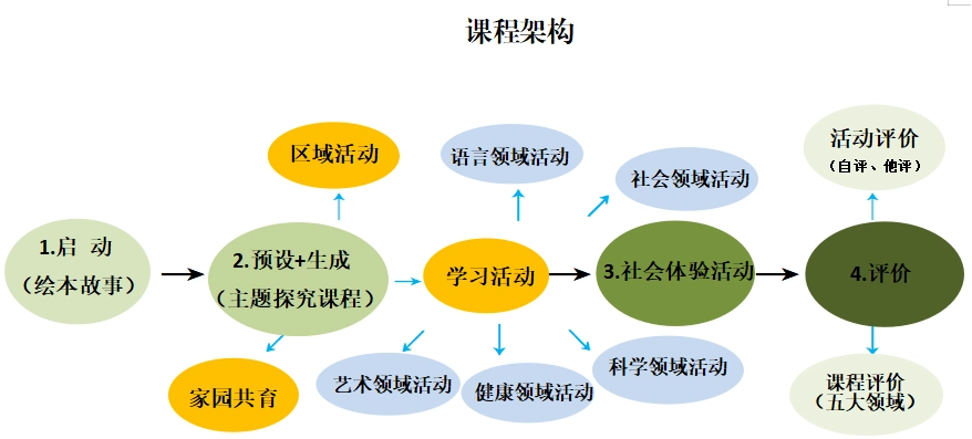 课程内容(主题统整):以“1 个核心绘本教学” 为切入点;联动“n个多元拓展活动”,包括学习活动、区域活动、家园共育活动和社会体验活动,形成主题统整的内容体系。
