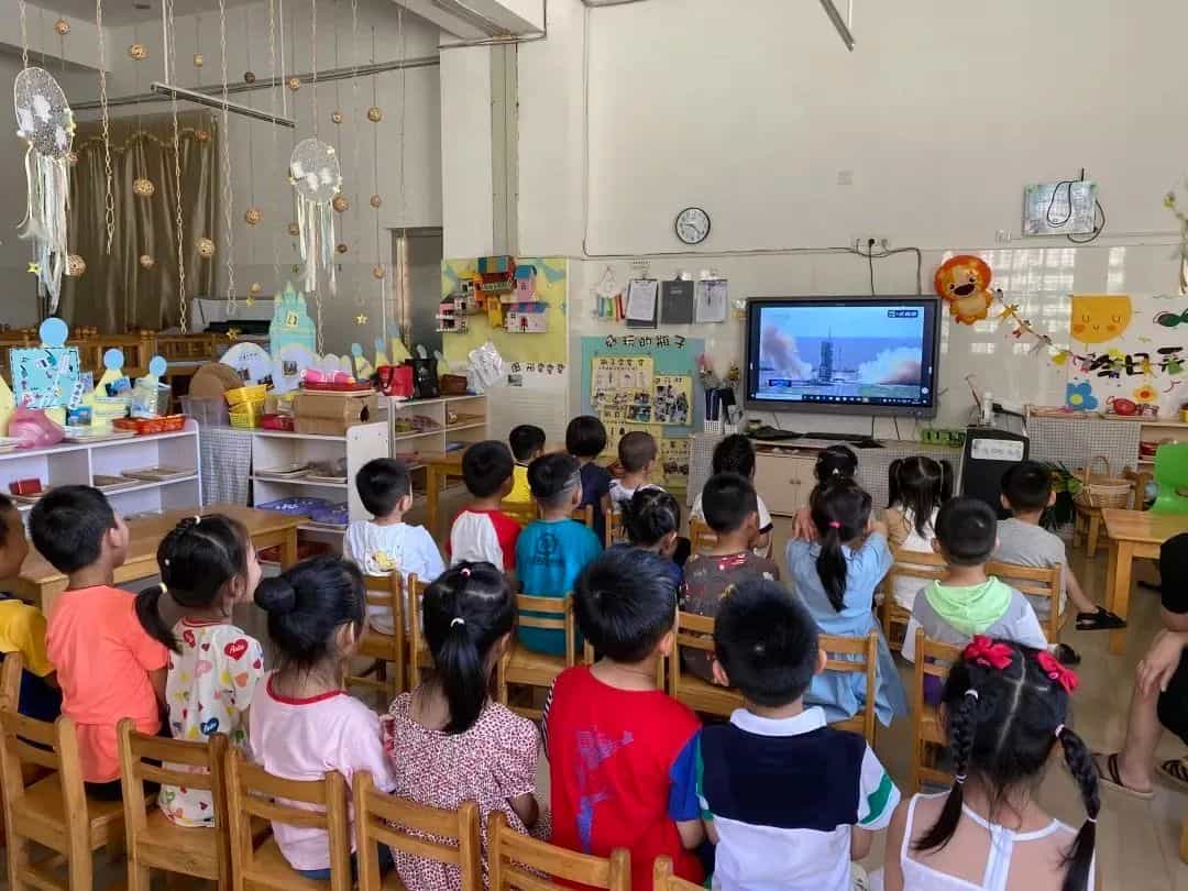 老师通过多媒体导入,组织幼儿观看视频,见证这一重要的历史时刻。